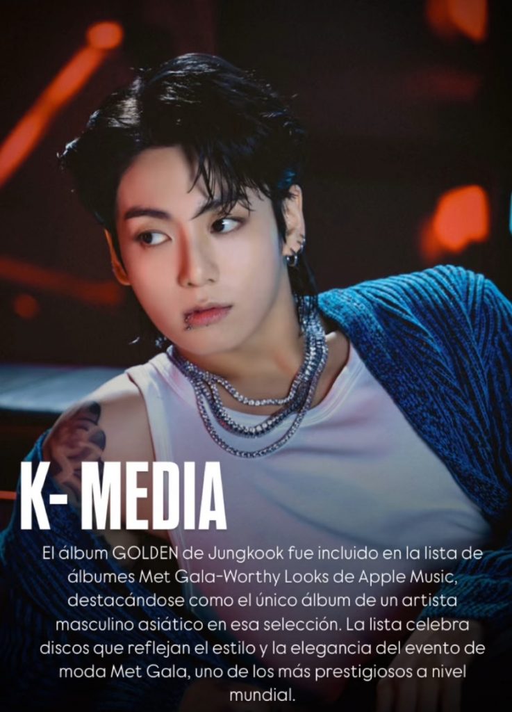 El álbum GOLDEN de Jungkook fue incluido en la lista de álbumes Met Gala-Worthy Looks de Apple Music, destacándose como el único álbum de un artista masculino asiático en esa selección. La lista celebra discos que reflejan el estilo y la elegancia del evento de moda Met Gala