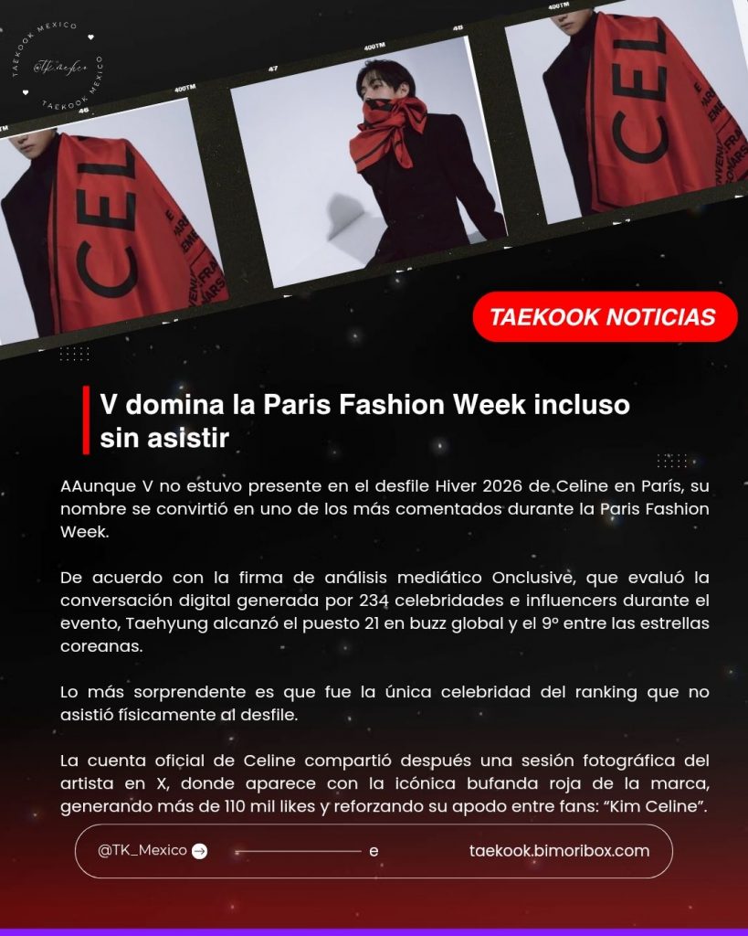 Según el análisis de la firma global de medios Onclusive, que evaluó la conversación digital generada por 234 celebridades e influencers durante la semana de la moda, Taehyung alcanzó el puesto 21 a nivel mundial en buzz mediático.