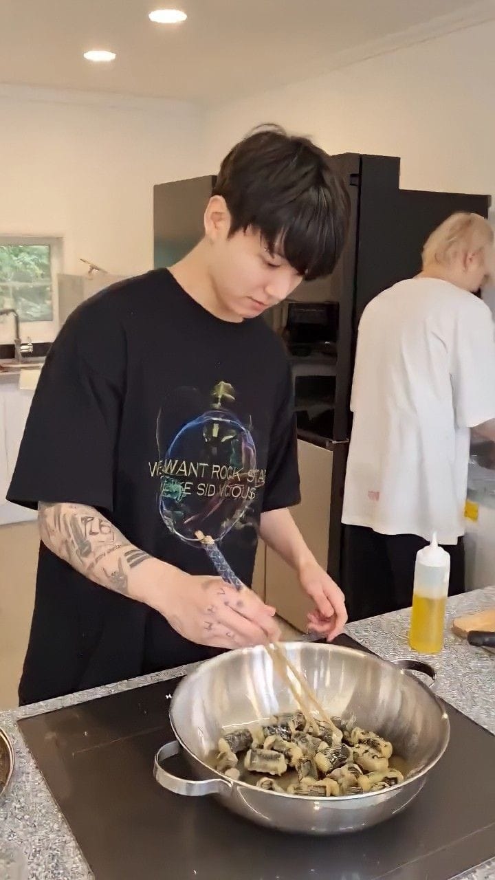También el 25 de abril de 2023, el cantante de Please Don’t Change sorprendió a sus seguidores con una transmisión en vivo matutina en Weverse, donde compartió su receta de “makguksu con aceite de perilla”. El aceite de perilla, derivado de las semillas de la planta de perilla, es un alimento básico en la cocina coreana y aporta un sabor a nuez único a los platos. Durante la transmisión en vivo , Jungkook detalló su enfoque del plato, combinando elementos tradicionales con su toque personal. Mencionó su afición por el aceite de perilla y cómo había estado experimentando con varias recetas para perfeccionar su versión de makguksu.