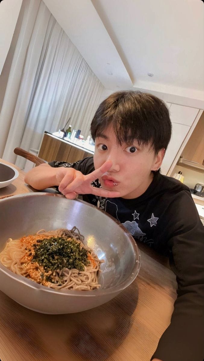 En 2023, JungKook hizo “Mak-guksu” (fideos de trigo sarraceno) con su toque y los llamó “Buldak Mayo Perilla Oil Makguksu” o “Bulmayo Perilla Oil Mak-guksu”. La receta se menciona en la nueva “Enciclopedia Cultural Hallyu”.
